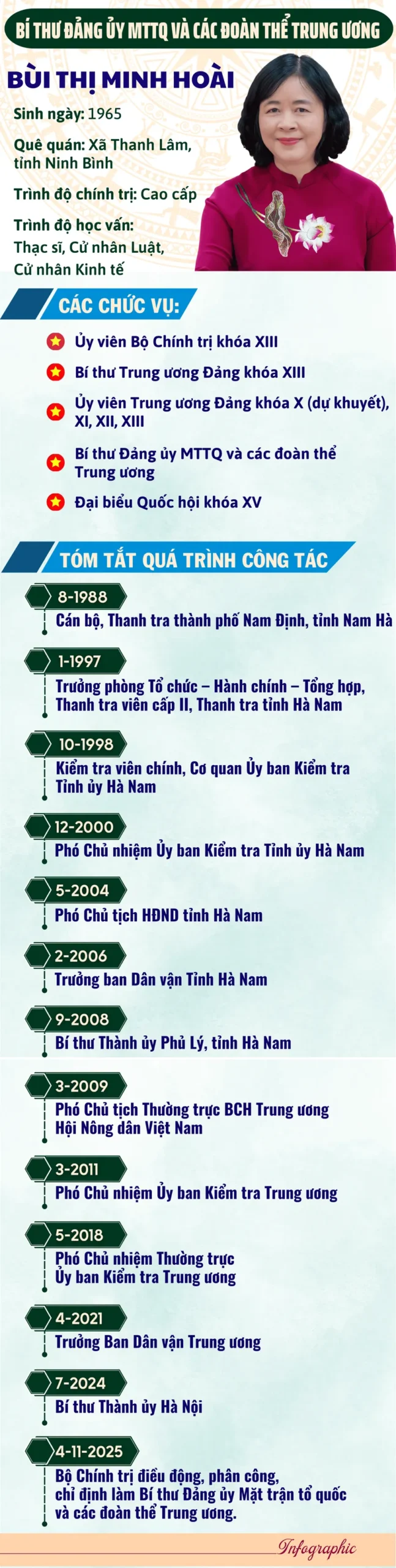 Theo đó, Bộ Chính trị đã quyết định điều động, phân công bà Bùi Thị Minh Hoài, Bí thư Thành ủy Hà Nội, giữ chức Bí thư Đảng ủy MTTQ, các đoàn thể Trung ương.